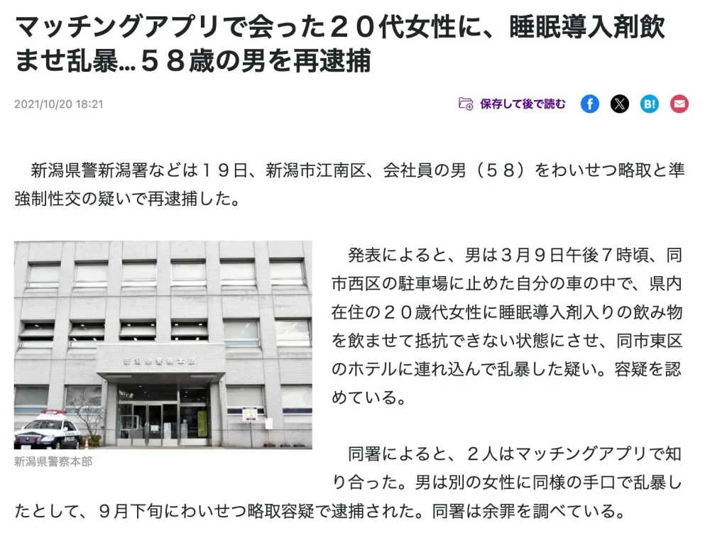 新潟市では58歳の男性がマッチングアプリで知り合った女性に睡眠導入剤を飲ませ、わいせつ行為に及んだ事件が発生しました。